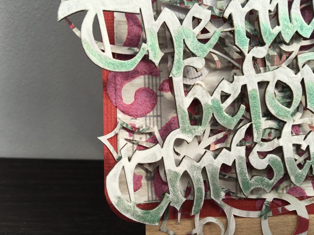 acrylic ink. Once dry, ‘watercolour’ the phrase with green mica powder mixed